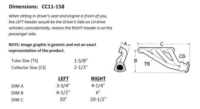 The CC11-158 is a swept-back, short header that fits Chevy and GMC pickups from 1960-1966 and 1987-1999 with a BluePrint engine, and also provides clearance for Flaming River rack-and-pinion setups in 1955-57 Chevy cars with a BluePrint engine. The CC11-158 fits straight plug cylinder heads ONLY!